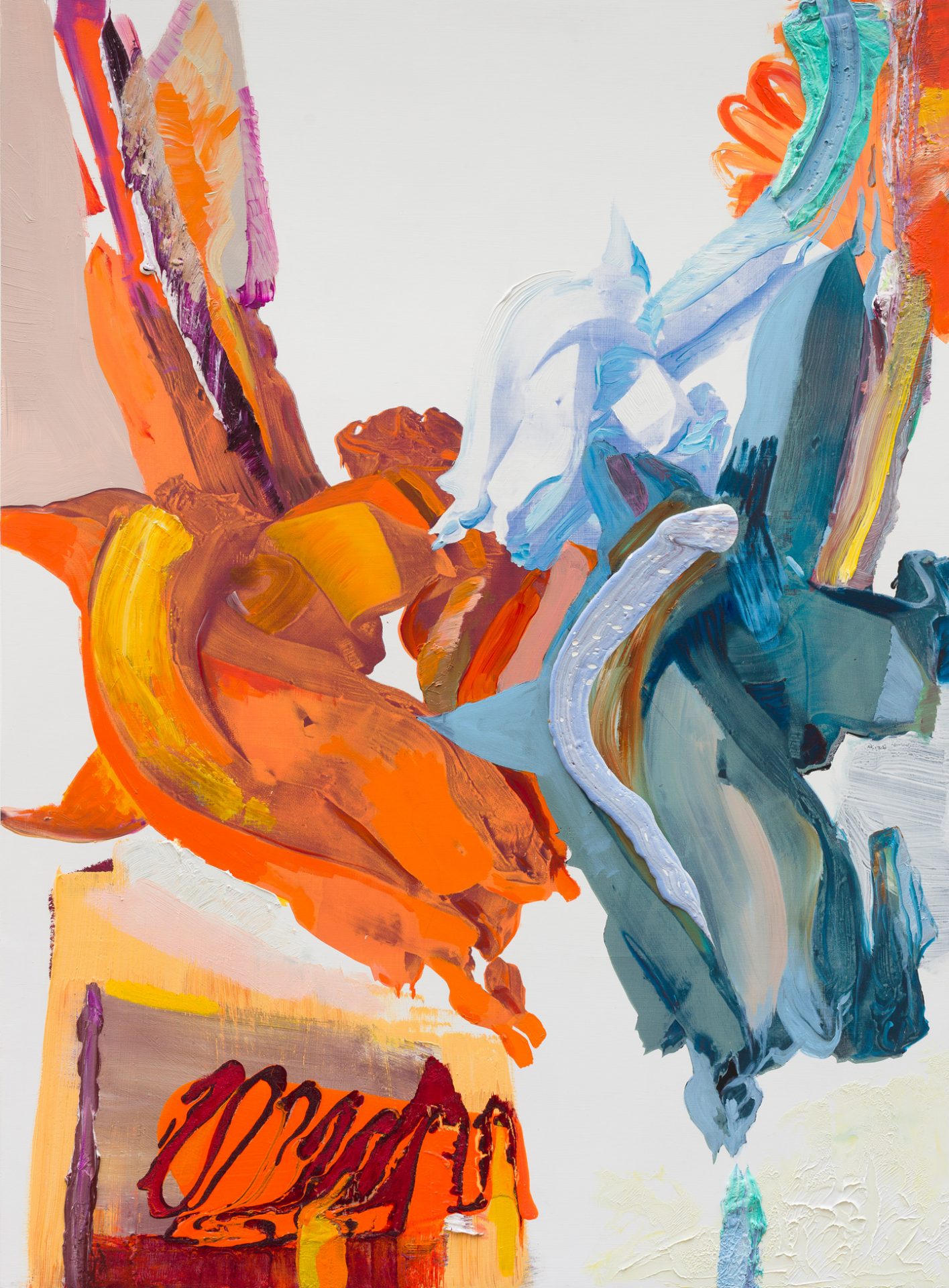 In Pia Fries’ works, layers of color, superimpositions, and dynamic interventions form the basis of the painting’s structure. The paint condenses into relief-like formations, so that the pictorial space can be physically experienced rather than illusionistic. The white empty spaces of the painting’s background are visible and function as an active counter-space so that the surface unfolds tensions in which color and emptiness enter into a relationship.